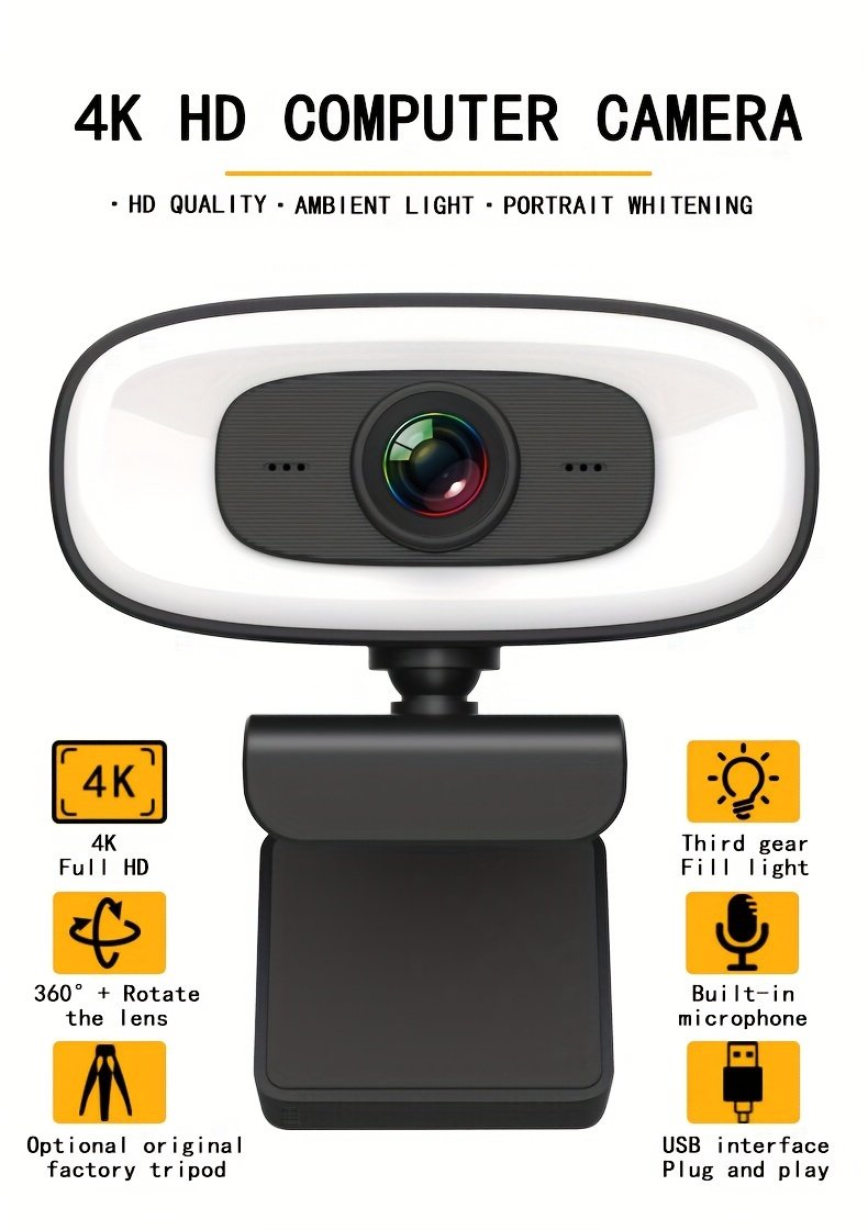 4K HD Computer Webcam, Plug And Play, No Driver Required USB Interface Webcam, Built-in Microphone, Webcast Fill Light, Voice Call Conference Camera, Work Camera, Laptop External Webcam